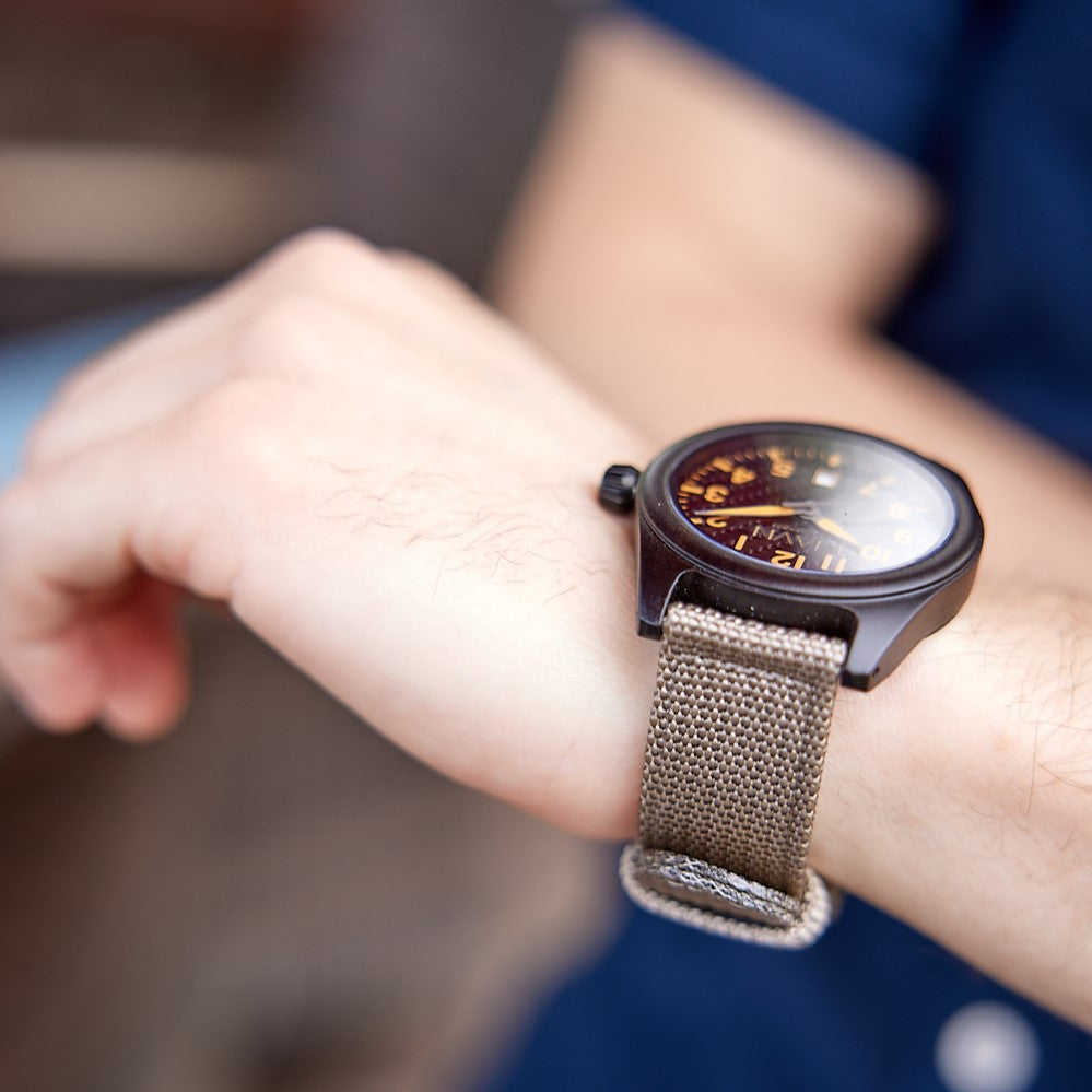 - Det beige nylonbandet ger både komfort och stil – perfekt för vardag och fritid.